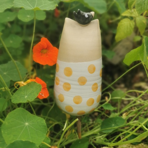 Jede Katze ist gedreht und mit viel Liebe geformt, wird dann von mir bemalt und gestaltet. Somit ist jede Katze ein Unikat und hat im Boden ein ca. 1 cm großes Loch um sie auf einem Stab in den Garten oder auf den Balkon ins Pflanzgefäß zu setzen.