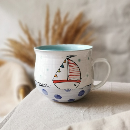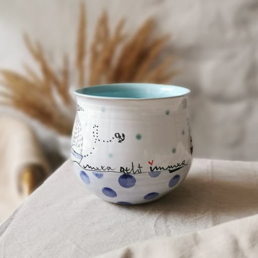 mit viel Liebe von Hand gedreht und einer zinnweißen glänzenden Glasur. Die bunten Illustrationen sind fest in die Glasur eingebrannt.