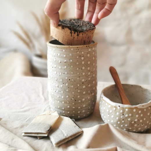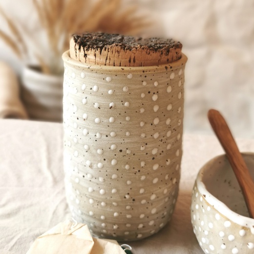 mit viel Liebe von Hand gedreht und kleinen weißen Glasur Punkten. Der Dosendeckel ist aus Naturkork.