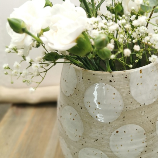 mit viel Liebe von Hand gedreht und großen creme weißen Glasurpunkten die leicht glänzend scheinen.