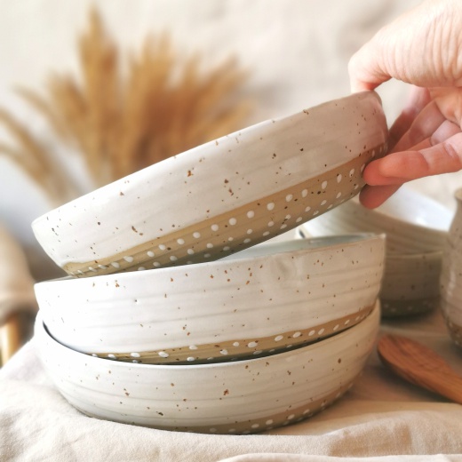 Mein Steinzeug Ton hat kleine natürliche braune Sprenkel. Die immer unterschiedlich stark ausgeprägt sind.