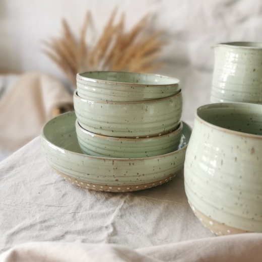 mit viel Liebe von Hand gedreht und einer pistaziengrünen Glasur die seidenmatt glänzt.