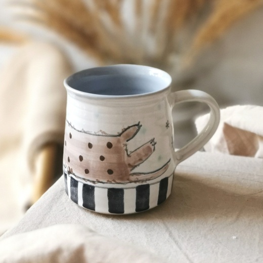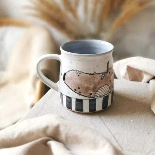 mit viel Liebe von Hand gedreht und einer zinnweißen glänzenden Glasur. Die bunten Illustrationen sind fest in die Glasur eingebrannt.