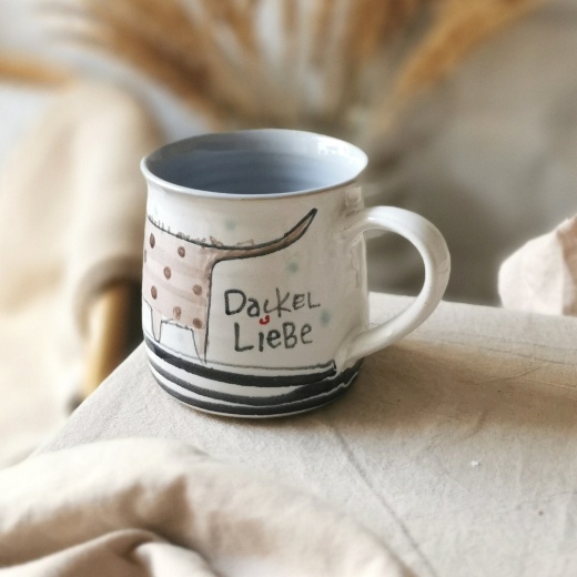 mit viel Liebe von Hand gedreht und einer zinnweißen glänzenden Glasur. Die bunten Illustrationen sind fest in die Glasur eingebrannt.