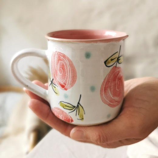 mit viel Liebe von Hand gedreht und einer zinnweißen glänzenden Glasur. Die bunten Illustrationen sind fest in die Glasur eingebrannt.