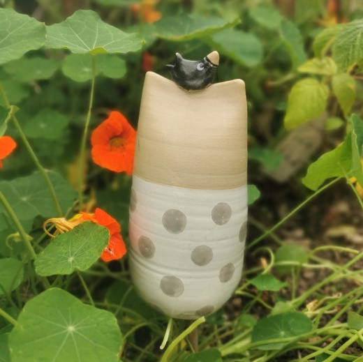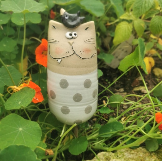 Jede Katze ist gedreht und mit viel Liebe geformt, wird dann von mir bemalt und gestaltet. Somit ist jede Katze ein Unikat und hat im Boden ein ca. 1 cm großes Loch um sie auf einem Stab in den Garten oder auf den Balkon ins Pflanzgefäß zu setzen.