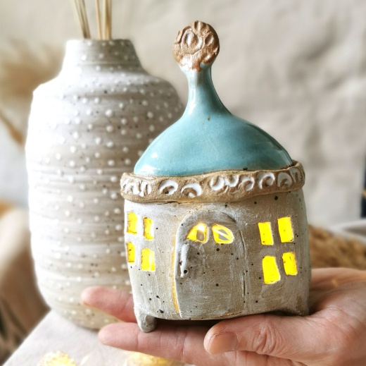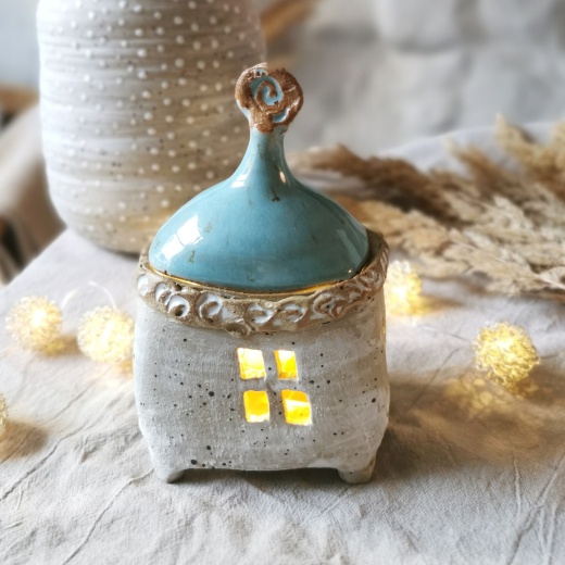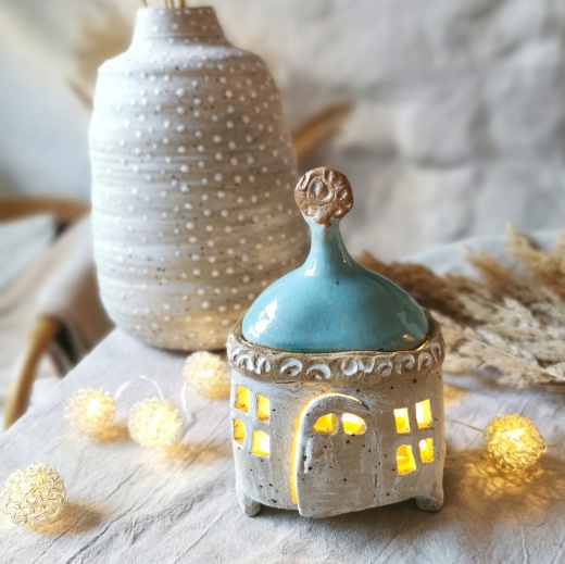 Mit viel Liebe von Hand gedreht und einer türkis farbenden Glasur die leicht glänzt. Die Lichtquelle gibt es gratis dazu.