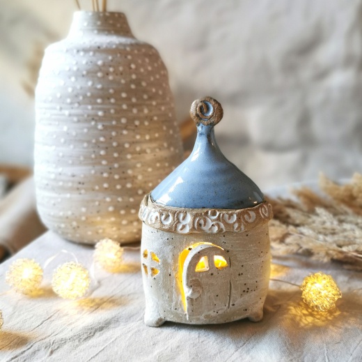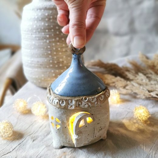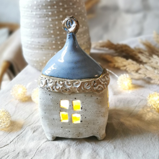 Mit viel Liebe von Hand gedreht und einer blaugrauen Glasur die leicht glänzt. Die Lichtquelle gibt es gratis dazu.