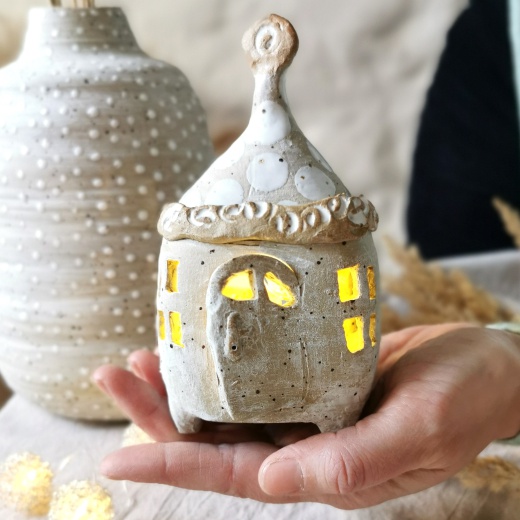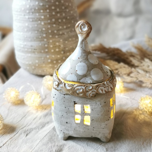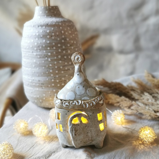 Mit viel Liebe von Hand gedreht und weißen Glasur Punkten die leicht glänzen. Die Lichtquelle gibt es gratis dazu.