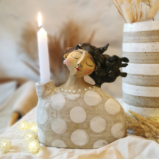 Diese Lichthalterin wurde mit viel Liebe modelliert, Nach dem 1. Brand habe ich sie mit einer weißen Glasur bemalt und gestaltet. Dann ein 2.tes mal bei 1250°C dicht gebrannt. Dadurch erhält sie ihren einzigartigen Ausdruck und Charakter. Jede Lichthalterin ist immer ein kleines Unikat und absolutes Einzelstück.