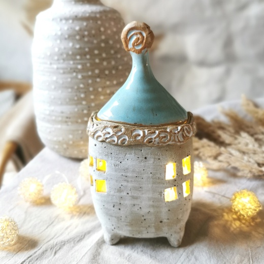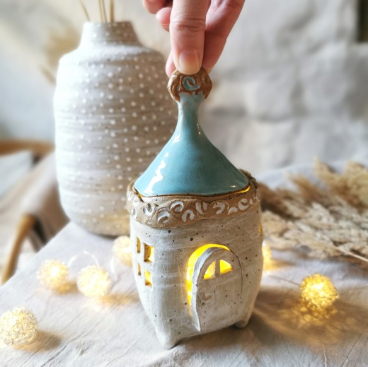 Mit viel Liebe von Hand gedreht und einer türkis farbenden Glasur die leicht glänzt. Die Lichtquelle gibt es gratis dazu.