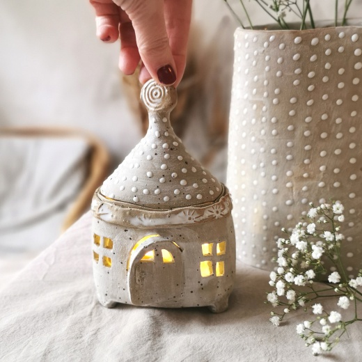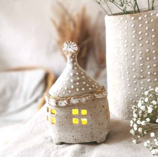 Mit viel Liebe von Hand gedreht und weißen Glasur Punkten die leicht glänzen. Die Lichtquelle gibt es gratis dazu.