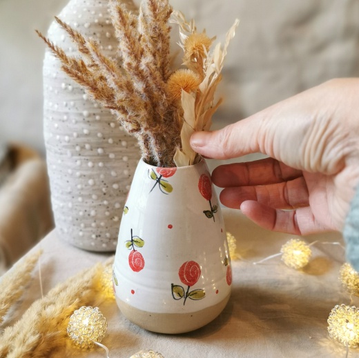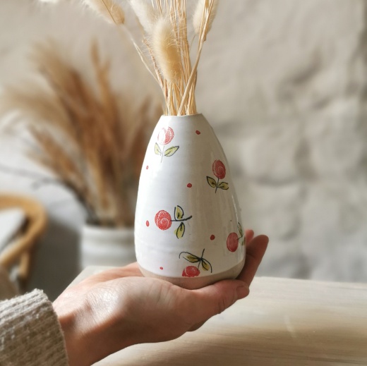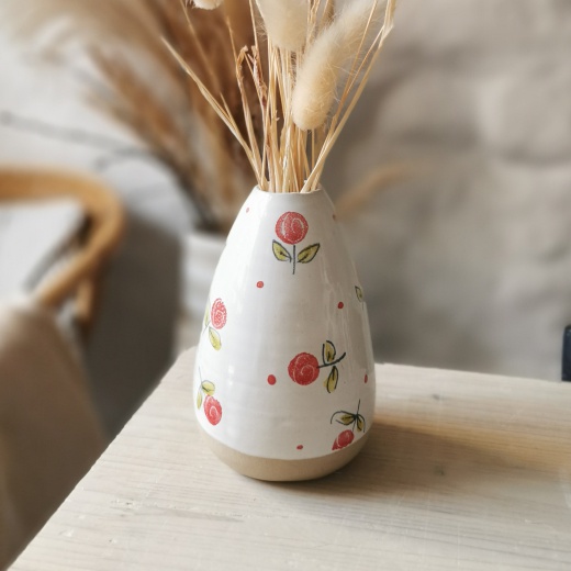 mit viel Liebe von Hand gedreht und einer strahlend weißen Glasur mit kleinen roten Rosen in der Majolika Technik bemalt.