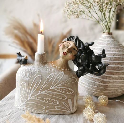 Diese Lichthalterin wurde mit viel Liebe modelliert, Nach dem 1. Brand habe ich sie mit einer weißen Glasur bemalt und gestaltet. Dann ein 2.tes mal bei 1250°C dicht gebrannt. Dadurch erhalten sie ihren einzigartigen Ausdruck und Charakter. Jeder Lichthalter ist immer ein kleines Unikat und absolutes Einzelstück.