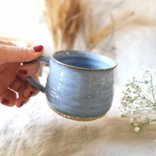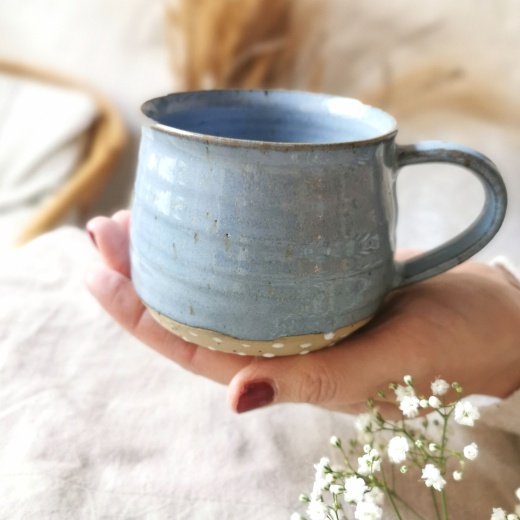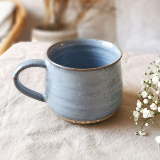 mit viel Liebe von Hand gedreht und einer blaugrauen Glasur die seidenmatt glänzt.