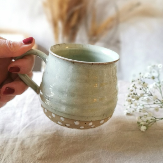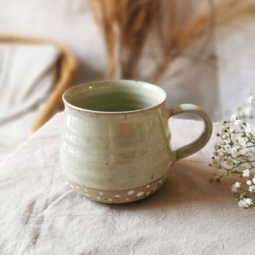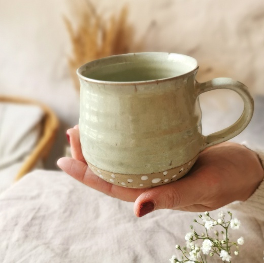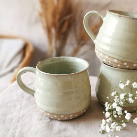 mit viel Liebe von Hand gedreht und einer pistaziengrünen Glasur die seidenmatt glänzt.