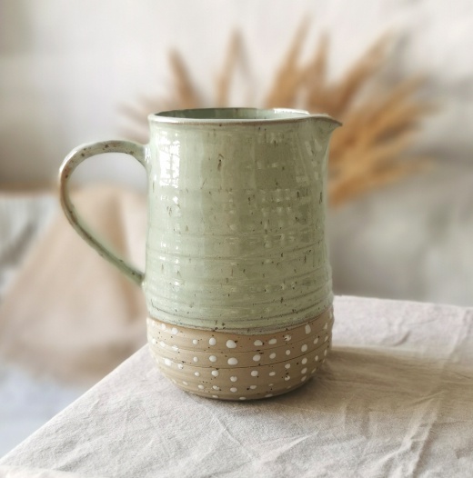 mit viel Liebe von Hand gedreht und einer pistaziengrünen Glasur die leicht glänzend scheint.