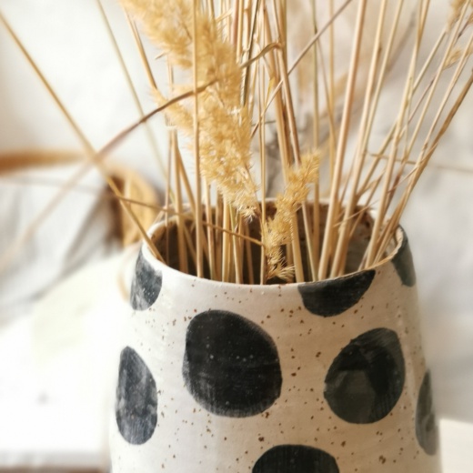 mit viel Liebe von Hand gedreht und einer weißen glänzenden Glasur und schwarzen Punkten. der Ton hat kleine braune Spots.