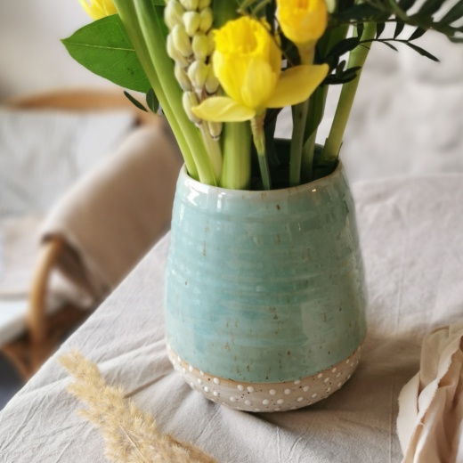 mit viel Liebe von Hand gedreht und einer türkisfarbenden Glasur die leicht glänzend scheinen.