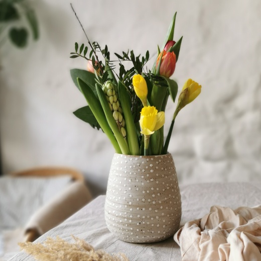 mit viel Liebe von Hand gedreht und kleinen creme weißen Glasurpunkten die leicht glänzend scheinen.