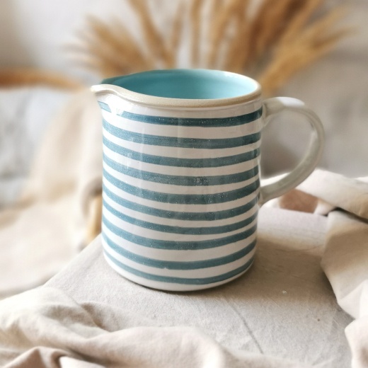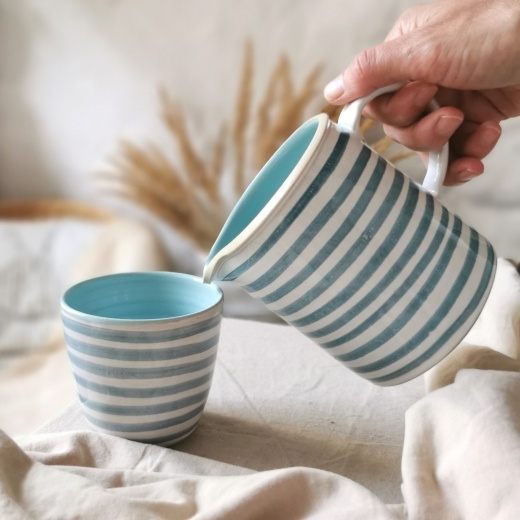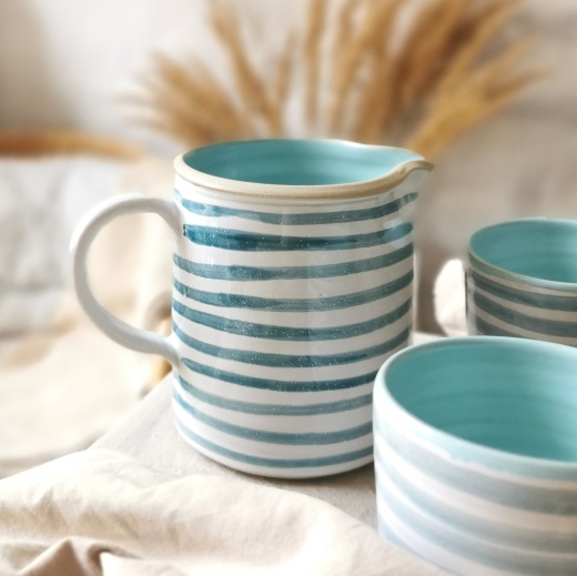 mit viel Liebe von Hand gedreht und einer zinnweißen glänzenden Glasur. Die bunten Illustrationen sind fest in die Glasur eingebrannt.