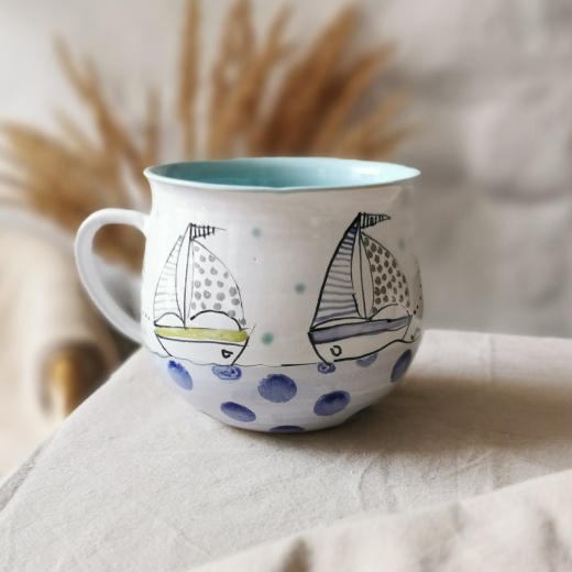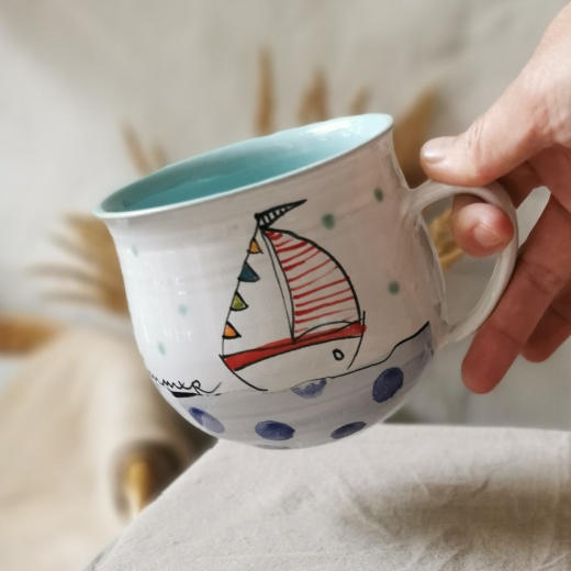 mit viel Liebe von Hand gedreht und einer zinnweißen glänzenden Glasur. Die bunten Illustrationen sind fest in die Glasur eingebrannt.