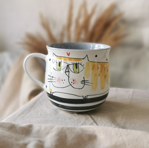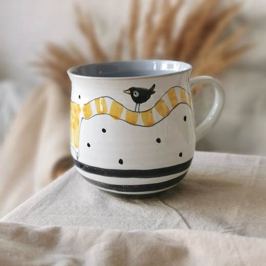 mit viel Liebe von Hand gedreht und einer zinnweißen glänzenden Glasur. Die bunten Illustrationen sind fest in die Glasur eingebrannt.