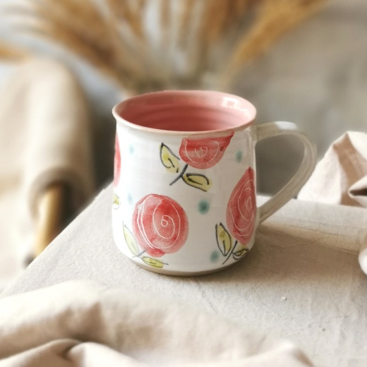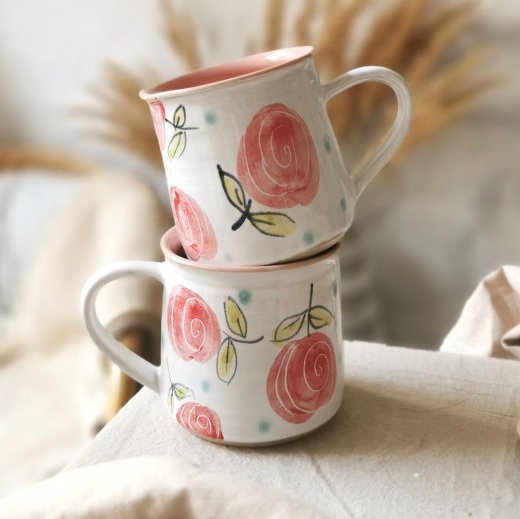 mit viel Liebe von Hand gedreht und einer zinnweißen glänzenden Glasur. Die bunten Illustrationen sind fest in die Glasur eingebrannt.
