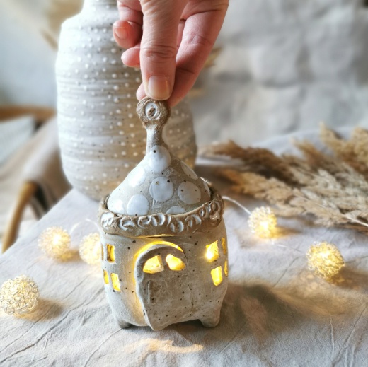 Mit viel Liebe von Hand gedreht und weißen Glasur Punkten die leicht glänzen. Die Lichtquelle gibt es gratis dazu.