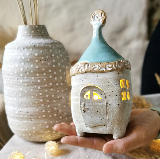 Mit viel Liebe von Hand gedreht und einer türkis farbenden Glasur die leicht glänzt. Die Lichtquelle gibt es gratis dazu.