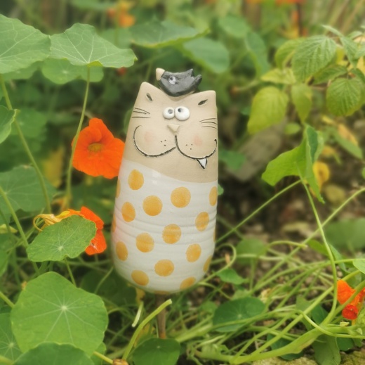 Jede Katze ist gedreht und mit viel Liebe geformt, wird dann von mir bemalt und gestaltet. Somit ist jede Katze ein Unikat und hat im Boden ein ca. 1 cm großes Loch um sie auf einem Stab in den Garten oder auf den Balkon ins Pflanzgefäß zu setzen.