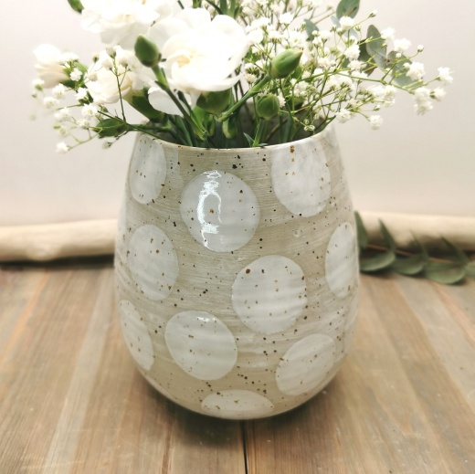 mit viel Liebe von Hand gedreht und großen creme weißen Glasurpunkten die leicht glänzend scheinen.