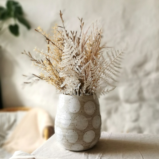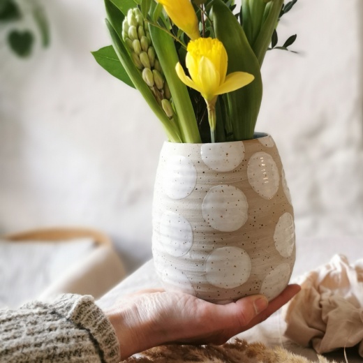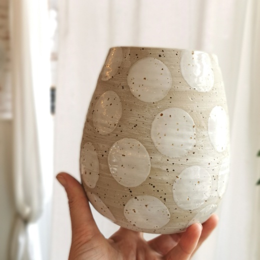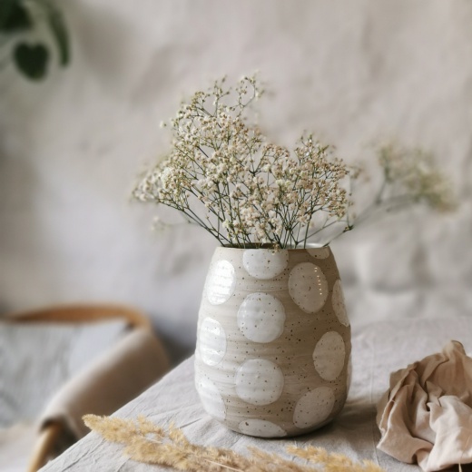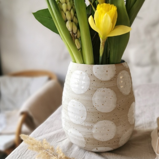 mit viel Liebe von Hand gedreht und großen creme weißen Glasurpunkten die leicht glänzend scheinen.