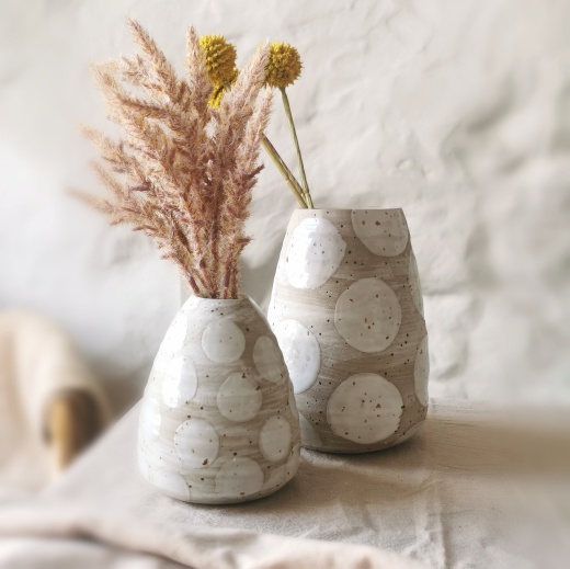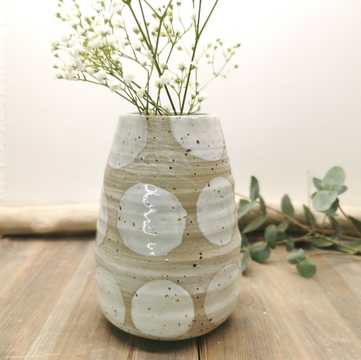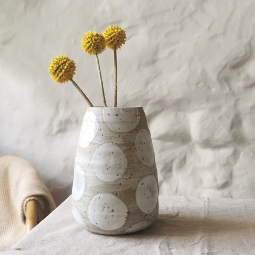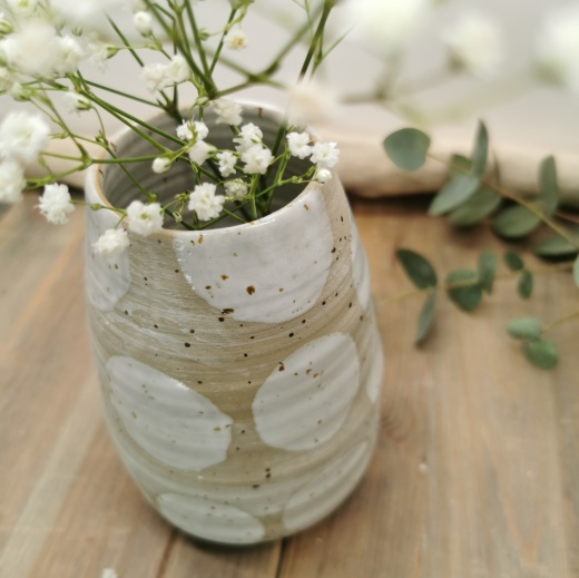mit viel Liebe von Hand gedreht und großen creme weißen Glasurpunkten die leicht glänzend scheinen.