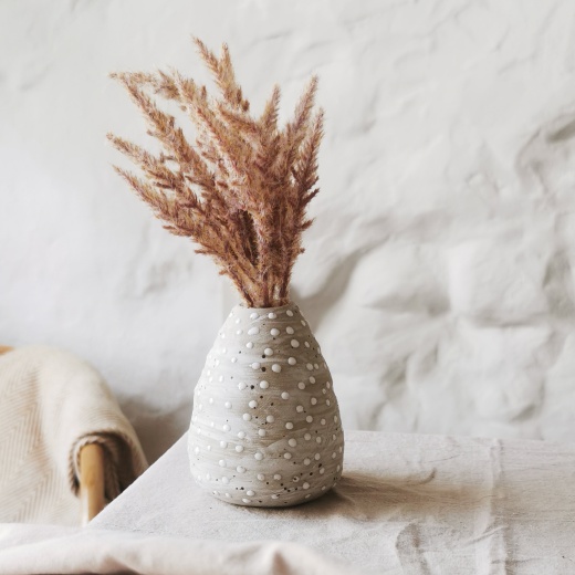 mit viel Liebe von Hand gedreht und kleinen creme weißen Glasurpunkten die leicht glänzend scheinen.