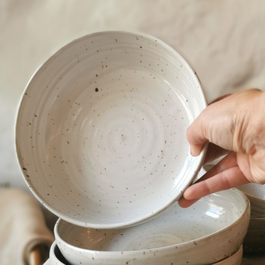 Mein Steinzeug Ton hat kleine natürliche braune Sprenkel. Die immer unterschiedlich stark ausgeprägt sind.