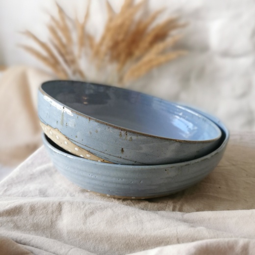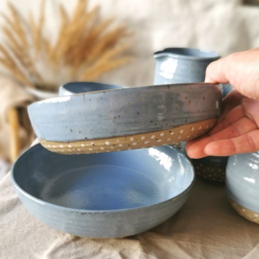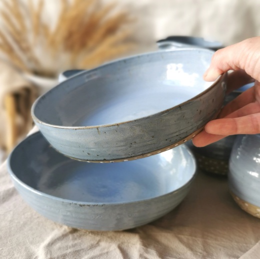mit viel Liebe von Hand gedreht und einer blaugrauen Glasur die seidenmatt glänzt.