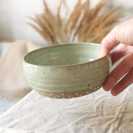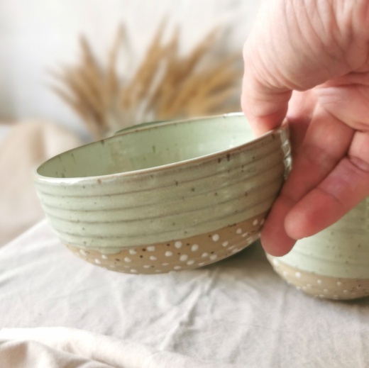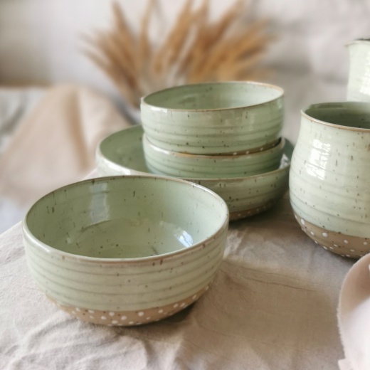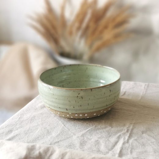 mit viel Liebe von Hand gedreht und einer pistaziengrünen Glasur die seidenmatt glänzt.