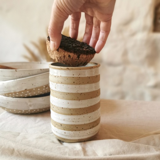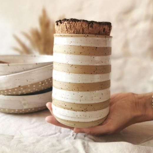 mit viel Liebe von Hand gedreht und weißen Glasur Streifen. Der Dosendeckel ist aus Naturkork.