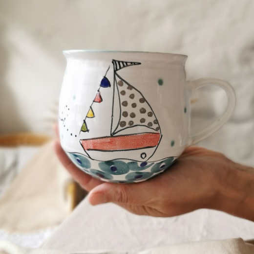mit viel Liebe von Hand gedreht und einer zinnweißen glänzenden Glasur. Die bunten Illustrationen sind fest in die Glasur eingebrannt.