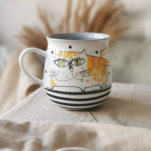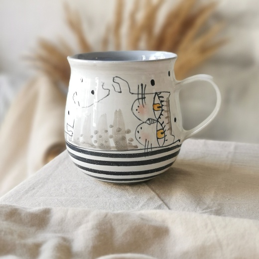 mit viel Liebe von Hand gedreht und einer zinnweißen glänzenden Glasur. Die bunten Illustrationen sind fest in die Glasur eingebrannt.
