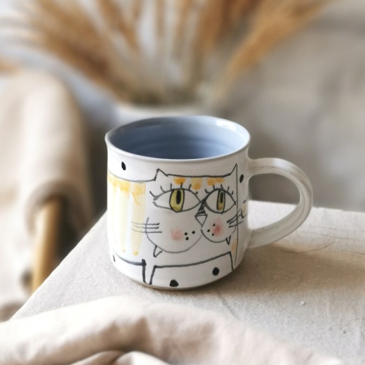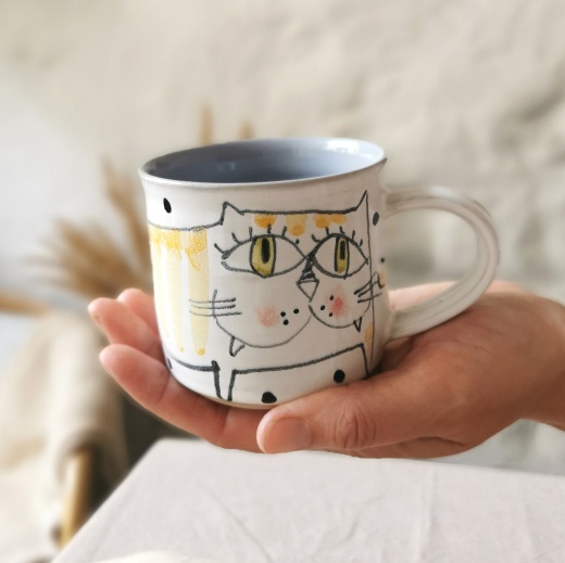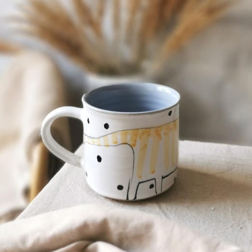 mit viel Liebe von Hand gedreht und einer zinnweißen glänzenden Glasur. Die bunten Illustrationen sind fest in die Glasur eingebrannt.