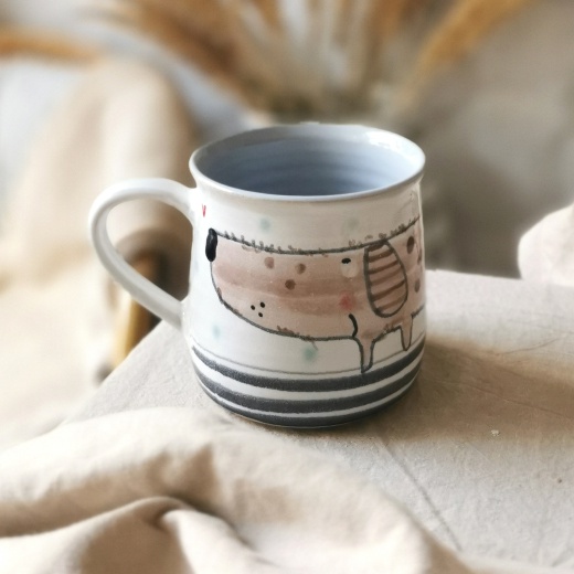 mit viel Liebe von Hand gedreht und einer zinnweißen glänzenden Glasur. Die bunten Illustrationen sind fest in die Glasur eingebrannt.