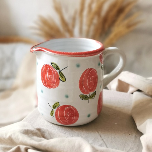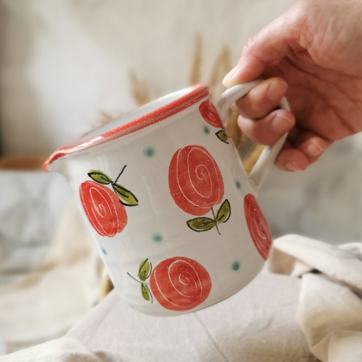 mit viel Liebe von Hand gedreht und einer zinnweißen glänzenden Glasur. Die bunten Illustrationen sind fest in die Glasur eingebrannt.