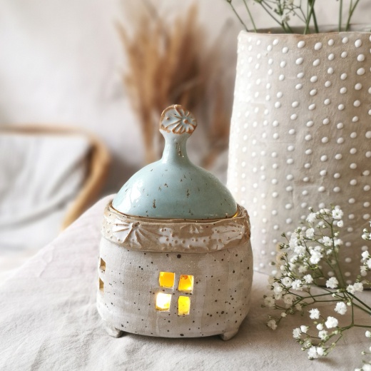 Mit viel Liebe von Hand gedreht und einer türkis farbenden Glasur die leicht glänzt. Die Lichtquelle gibt es gratis dazu.