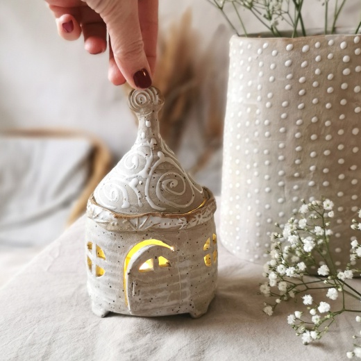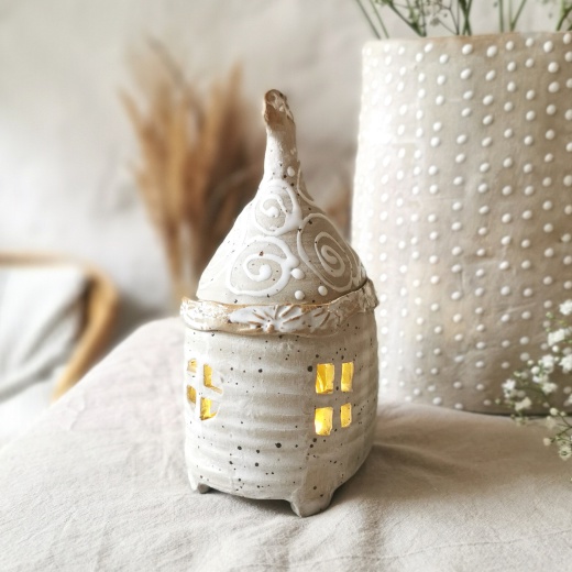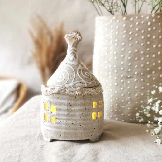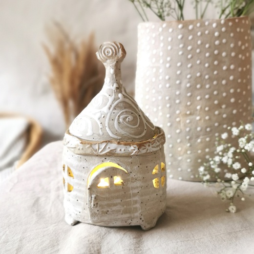 Mit viel Liebe von Hand gedreht und weiße Glasurkringel die leicht glänzen. Die Lichtquelle gibt es gratis dazu.