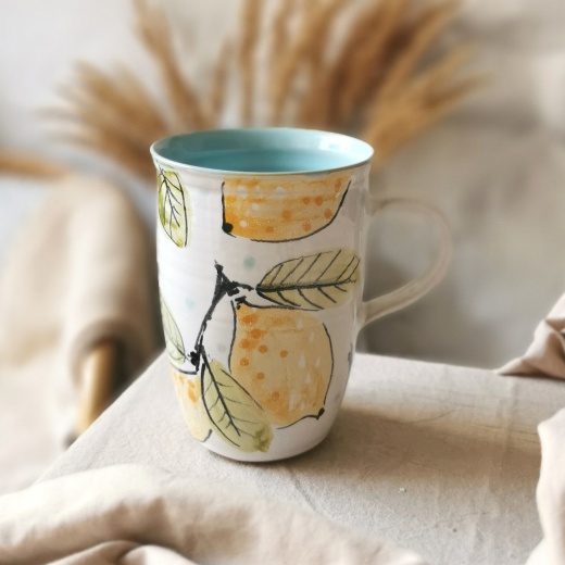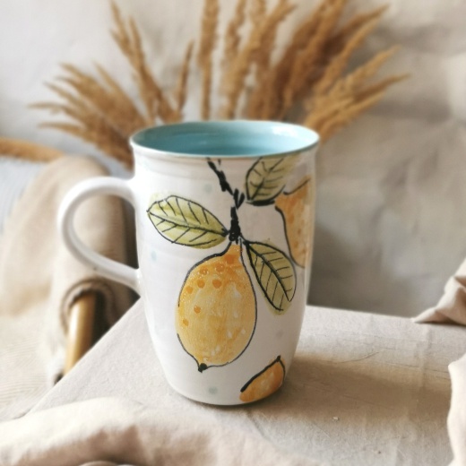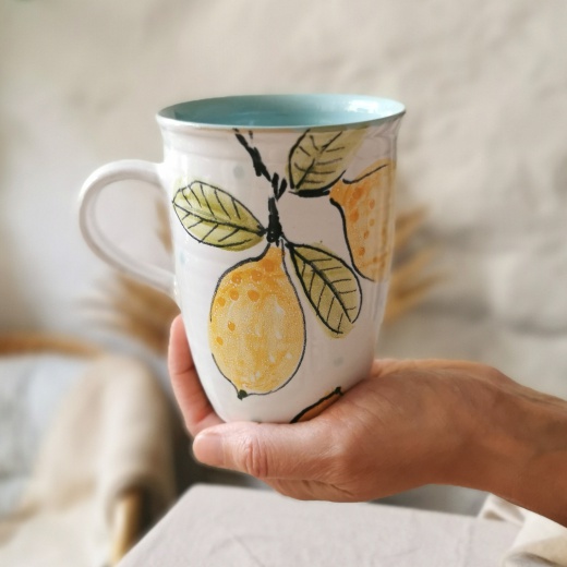 mit viel Liebe von Hand gedreht und einer zinnweißen glänzenden Glasur. Die bunten Illustrationen sind fest in die Glasur eingebrannt.