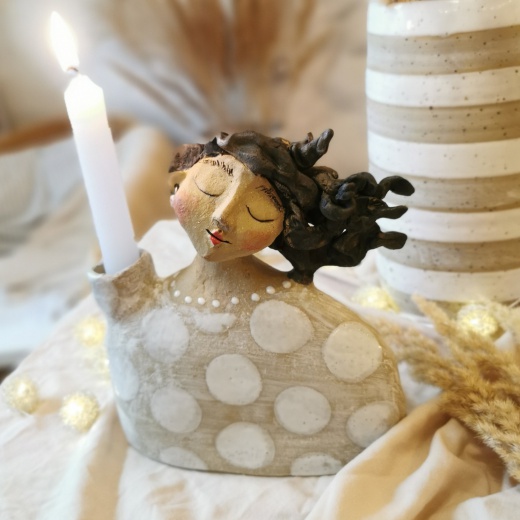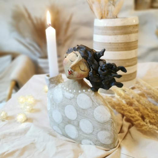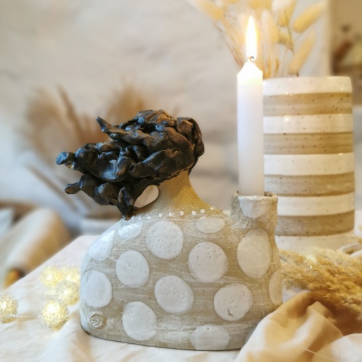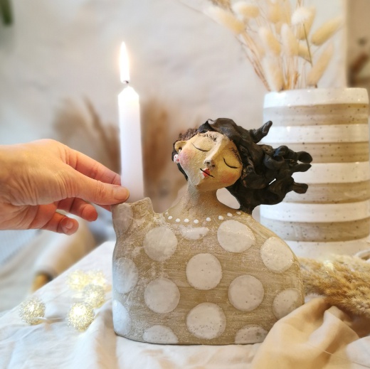 Diese Lichthalterin wurde mit viel Liebe modelliert, Nach dem 1. Brand habe ich sie mit einer weißen Glasur bemalt und gestaltet. Dann ein 2.tes mal bei 1250°C dicht gebrannt. Dadurch erhält sie ihren einzigartigen Ausdruck und Charakter. Jede Lichthalterin ist immer ein kleines Unikat und absolutes Einzelstück.