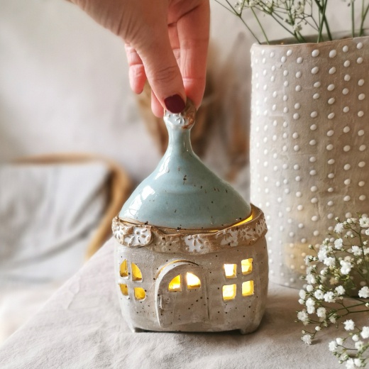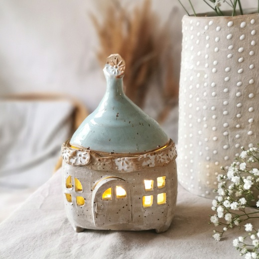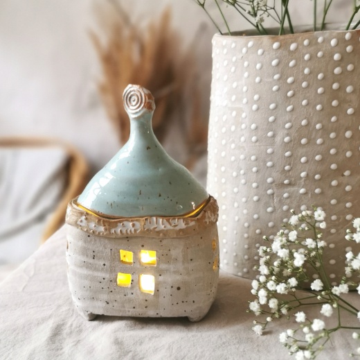 Mit viel Liebe von Hand gedreht und einer türkis farbenden Glasur die leicht glänzt. Die Lichtquelle gibt es gratis dazu.