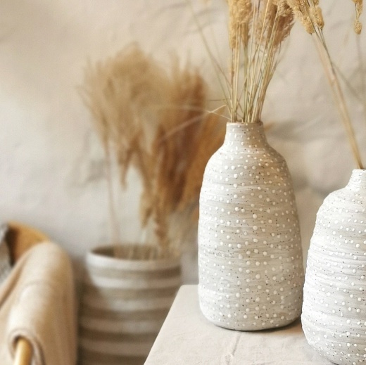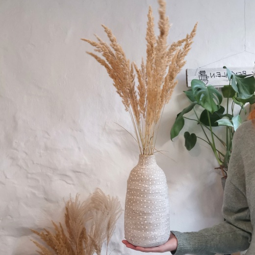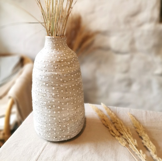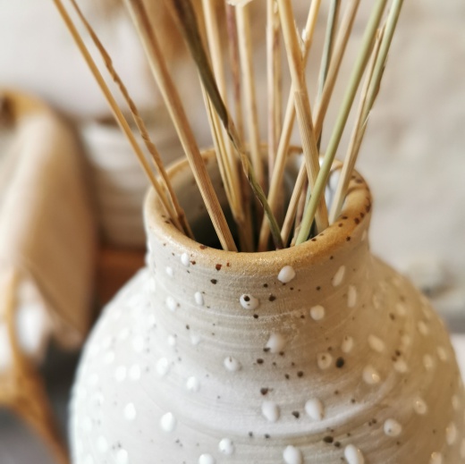 Mein Steinzeug Ton hat kleine natürliche Sprenkel mit unterschiedlich starker Ausprägung. Die Vase wirkt mit den passenden Gräsern wie ein Tag am Meer.